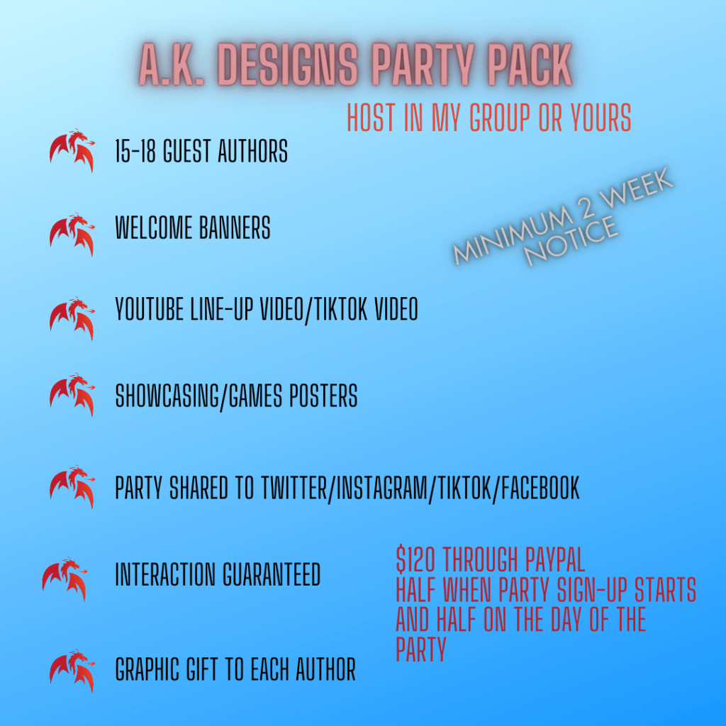 Did you ever do a takeover and no one showed up? Not even the host or author? Or going back 24 hours later to check on your games, and finding no comments? With Angelina Kerner at the helm, you are guaranteed that will never happen. I have been to dozens of her release parties, and not only are they unique and interesting, but there is always interaction with the host, other authors, and best of all, the readers. Angelina puts a new spin on parties, making sure the readers engage with the authors and rewarding them with different ways to win prizes. If you’re planning a release party, I highly recommend Angelina Kerner. She will go above and beyond to make your party the absolute best it can be, making it an enjoyable and stress-free event for you, the author. -Madison Granger